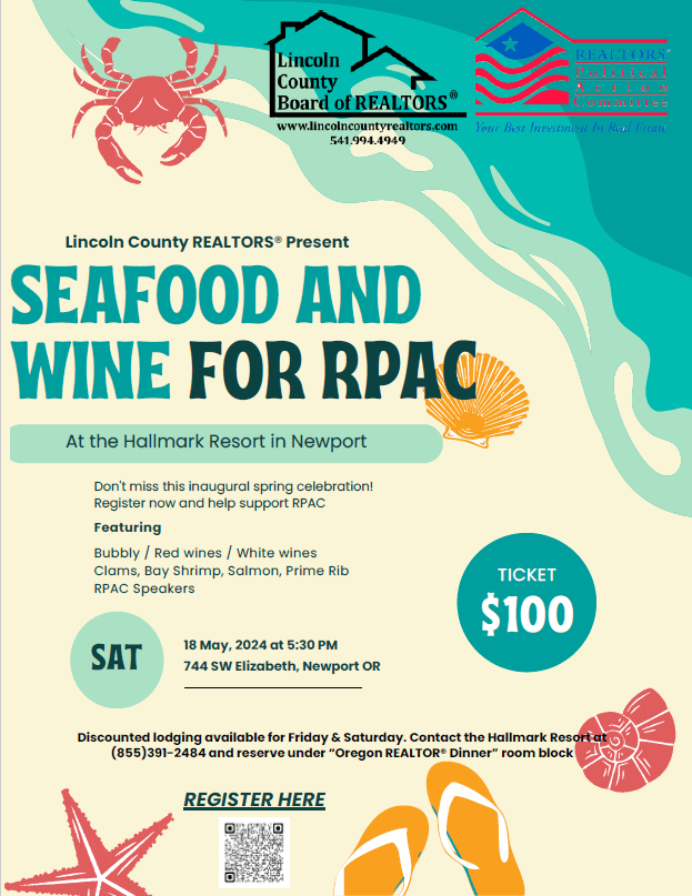 Discounted Rooms: To make reservations, call the hotel directly at 1-855-391-2484 and identify yourself as a participant of the Oregon Realtors Dinner/Lincoln County Board of Realtors/Oregon Coast MLS to receive the group rates. All reservation requests must be received on or before April 24, 2024. Individual guests will be responsible for room, tax, and incidental charges upon checkout.
